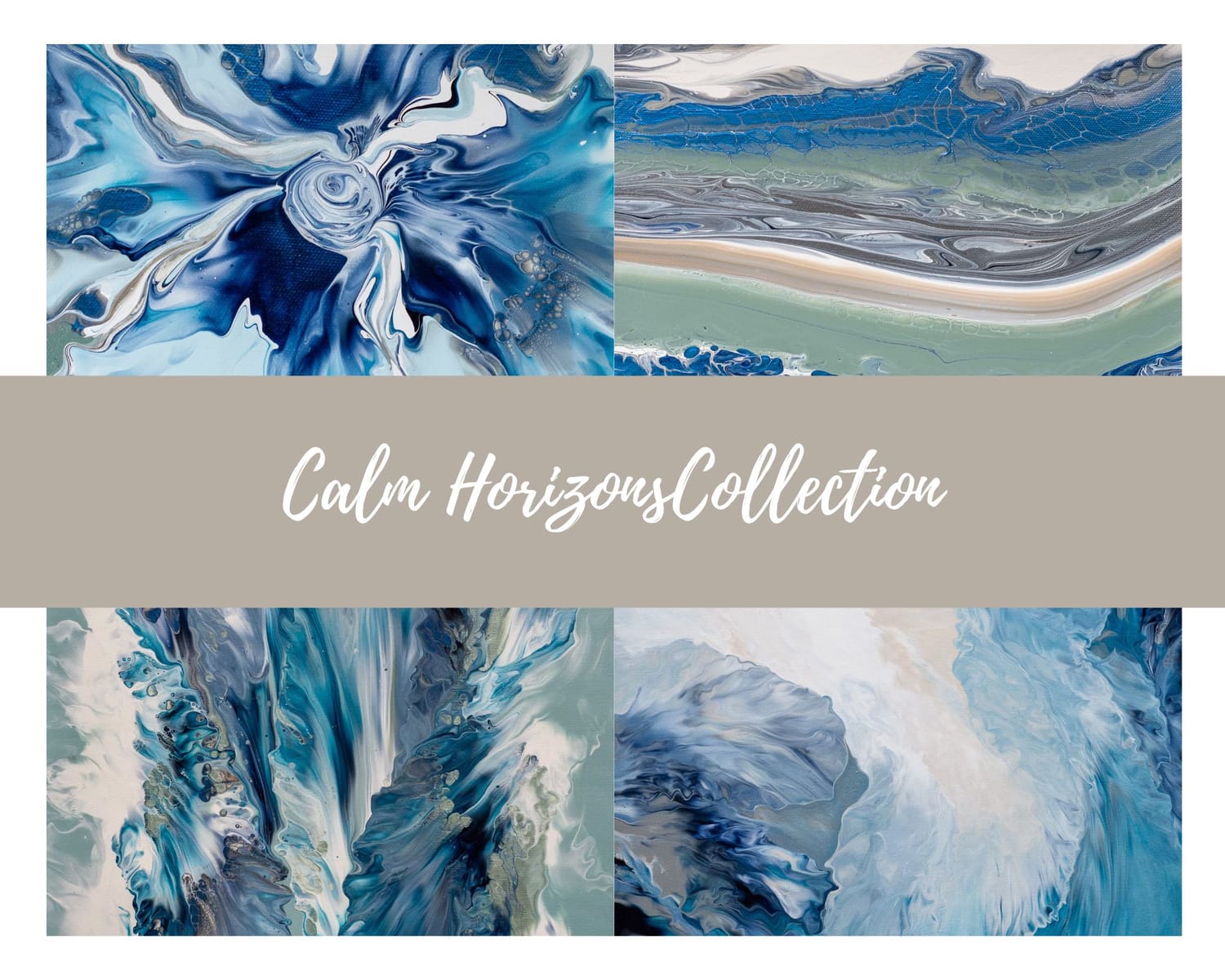 Later, in my studio, I began working with fluid acrylics, allowing the paint to move the same way water does—spreading, flowing, finding its own rhythm instead of being controlled. What started appearing on the canvas looked less like paintings and more like moving horizons… quiet places where the eye could rest and the mind could breathe again.