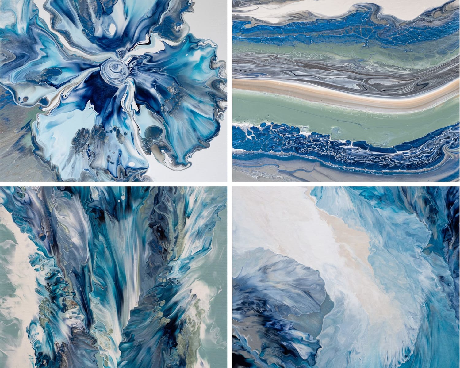 Each painting is created using fluid acrylics, a medium that allows pigment to move organically across the canvas, echoing the natural rhythms of tide, mist, and shifting light. Rather than forcing rigid forms, I guide the flow of the paint, allowing the materials themselves to participate in the creation of the image.